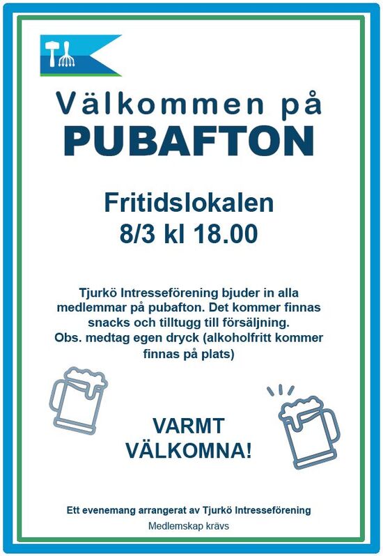 Tjurkö Intresseförening bjuder in alla medlemmar på pubafton.